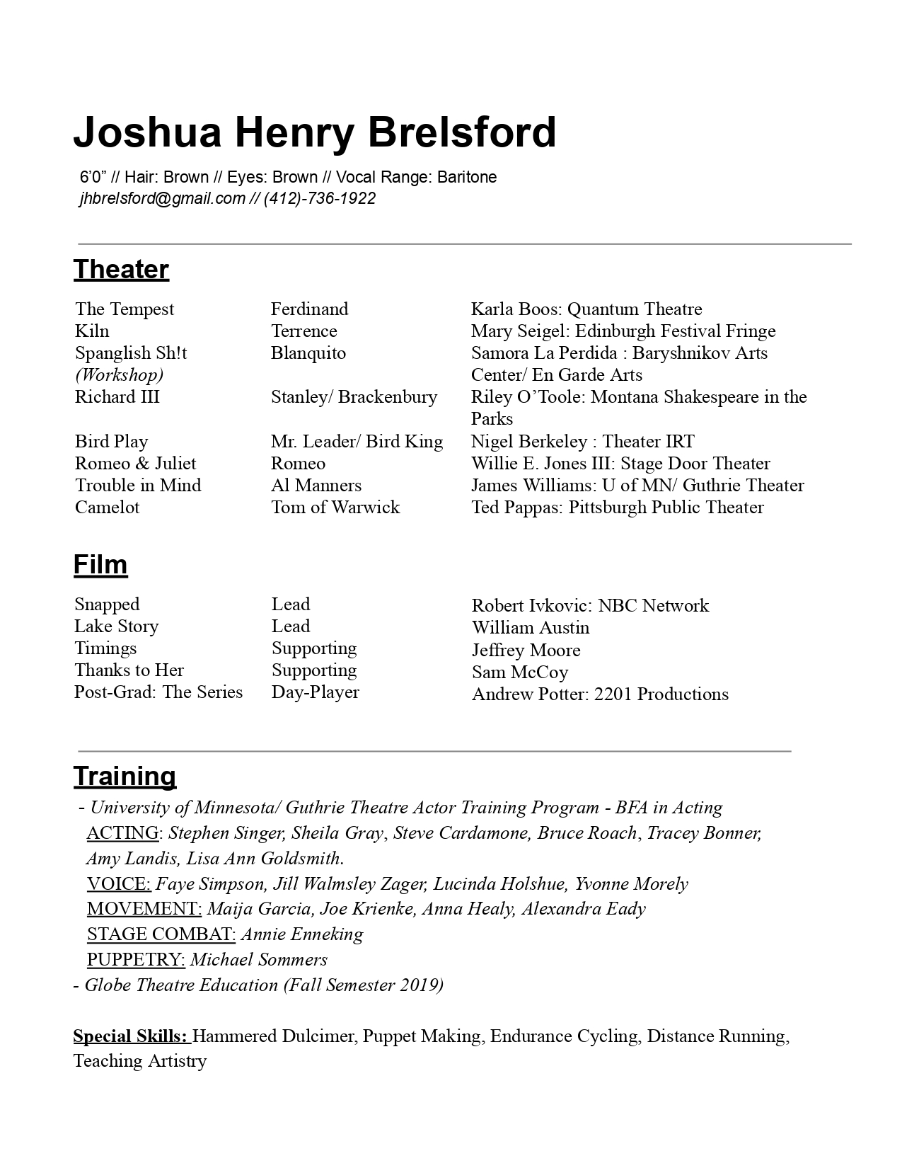 He has performed for communities in Minneapolis, Atlanta, Pittsburgh, and rural Montana. In 2024, he debuted his first play, KILN, at the Edinburgh Fringe Festival under the direction of Mary Grace Seigel. With the collaboration of Crumb to a Bird Ensemble, this family drama was later toured to Pittsburgh, and New York City. In 2022, Joshua founded Smoke n’ Shake Theatre, an immersive theatre project highlighting the works of William Shakespeare in direct collaboration with the cannabis industry of New York State. He received training from the University of Minnesota/ Guthrie Theater Actor Training Program, The Globe Theater, and The Pittsburgh Public Theater.
